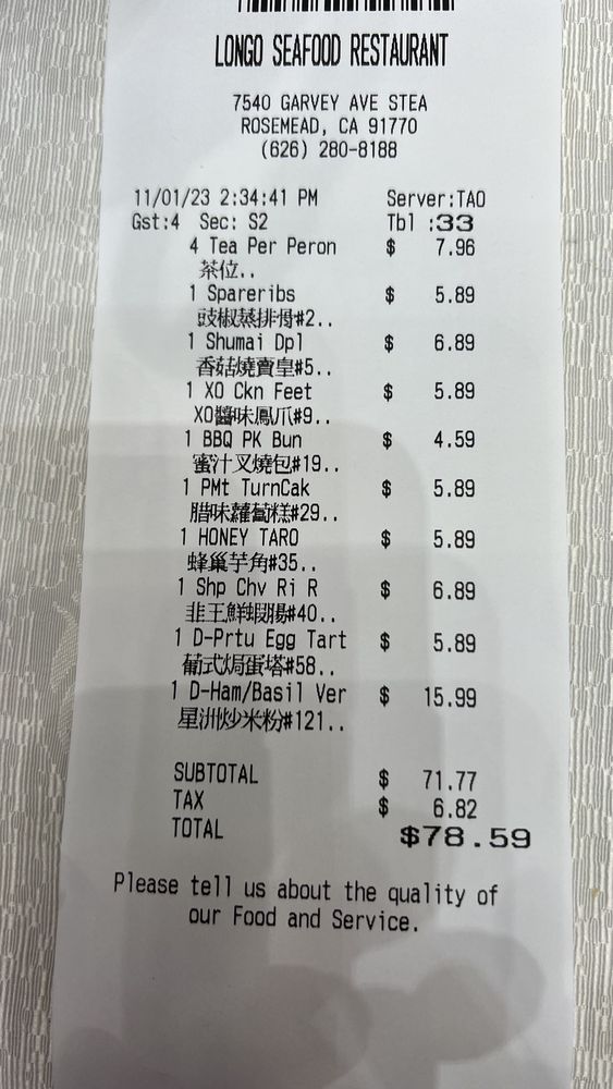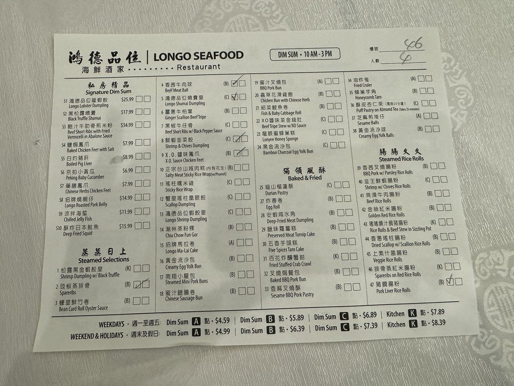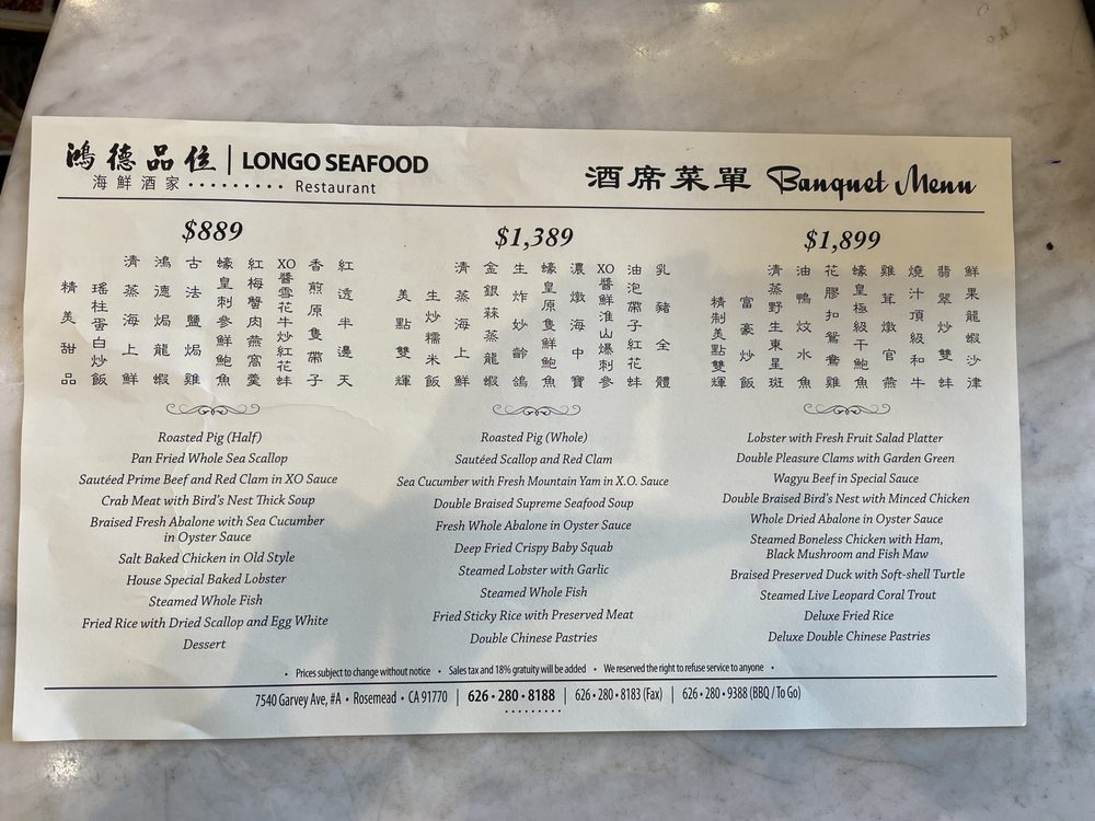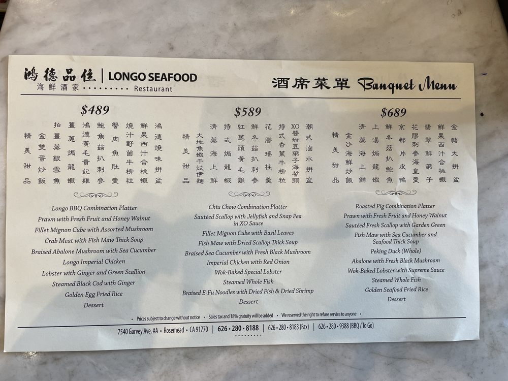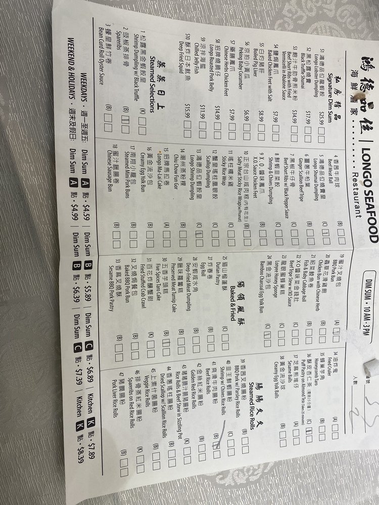 Introducing the menu at Longo Seafood Restaurant, located in Rosemead, CA, offers a delectable array of seafood, dim sum, and Cantonese dishes. With a variety of options for vegans and limited options for vegetarians, Longo Seafood provides a casual yet classy dining experience. The restaurant accepts reservations and offers delivery and takeout services. Customers praise the fresh and delicious seafood, with standout dishes like soy sauce chicken, shrimp dumplings, and pork shumai. The cozy interior and excellent service add to the overall dining experience, making it a go-to spot for dim sum and Chinese cuisine lovers. Additionally, Longo Seafood offers catering services for special occasions, making it a great choice for groups and families looking to enjoy a tasty meal together. Whether it's for breakfast, brunch, lunch, or dinner, Longo Seafood Restaurant is a must-visit establishment for those craving authentic Cantonese flavors.